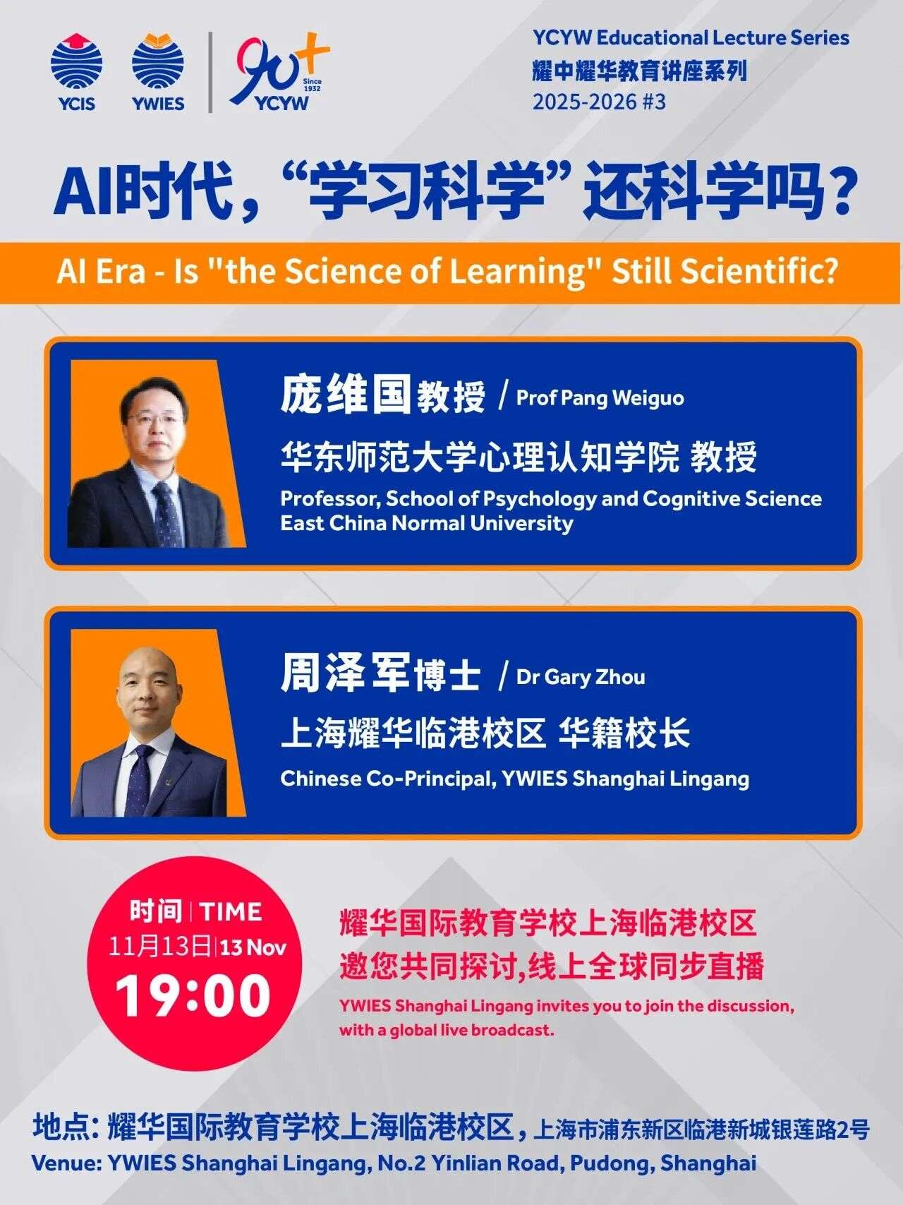 11 月 13 日,耀中耀华机构在线教育论坛如期举行。耀华临港中方校长周泽军携手华东师范大学心理与认知科学学院教授庞维国,与学生代表Jenny、家长代表 Jessica 共同相聚,围绕 AI 时代背景下学习科学的核心议题展开深度探讨,解锁高效学习的密码,厘清 AI 与学习的关系。